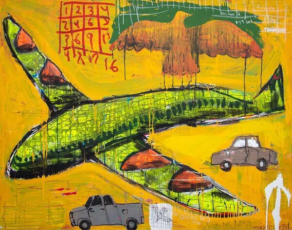 Casey McGlynn’s work exists at the intersection of memory and myth, where personal experience transforms into something universally resonant. His canvases pulse with imagery drawn from daily life: animals, birds from his studio window, numbers from memorized math times tables, pop culture references, and archival imagery, all rendered in a distinctive surrealist pop aesthetic. McGlynn builds his compositions like visual patchworks, layering paint and mixed media onto textured surfaces that echo everything from traditional quilting to underground comics. The result is art that feels simultaneously chaotic and intimate, delivered with what critic Gary Michael Dault described as “warm and compassionate abandon.” These are paintings that tell stories while leaving room for viewers to write themselves into the narrative.