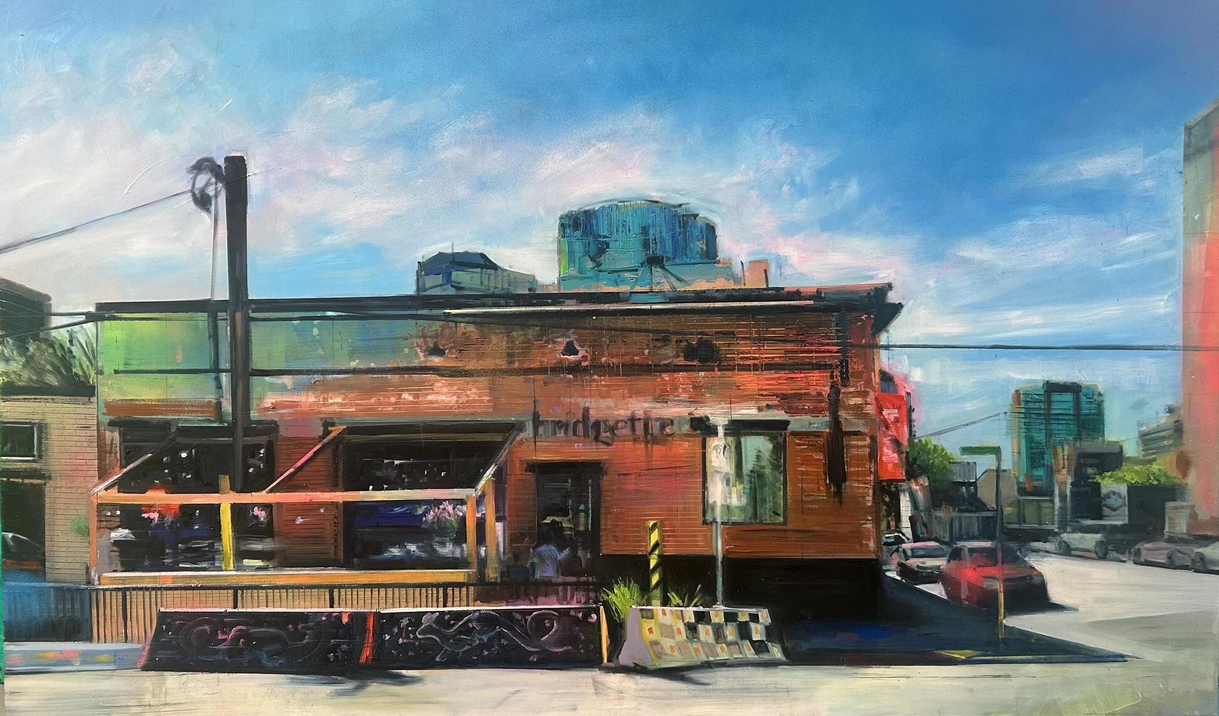 Though her subject matter is diverse, Harris is best known for her nostalgic depictions of familiar buildings in urban landscapes. Her choice of subject is largely motivated by colour, light, and shadow. Through a distinct use of these elements and a painterly approach, Harris's expressive vitality provokes an alternative perception of familiar urban spaces. She revels in the unpredictability of colour interactions and embraces the beauty of unresolved moments. Her methodical application of colour balances theory and practice while emphasizing the potent impact of layering light and shadow.