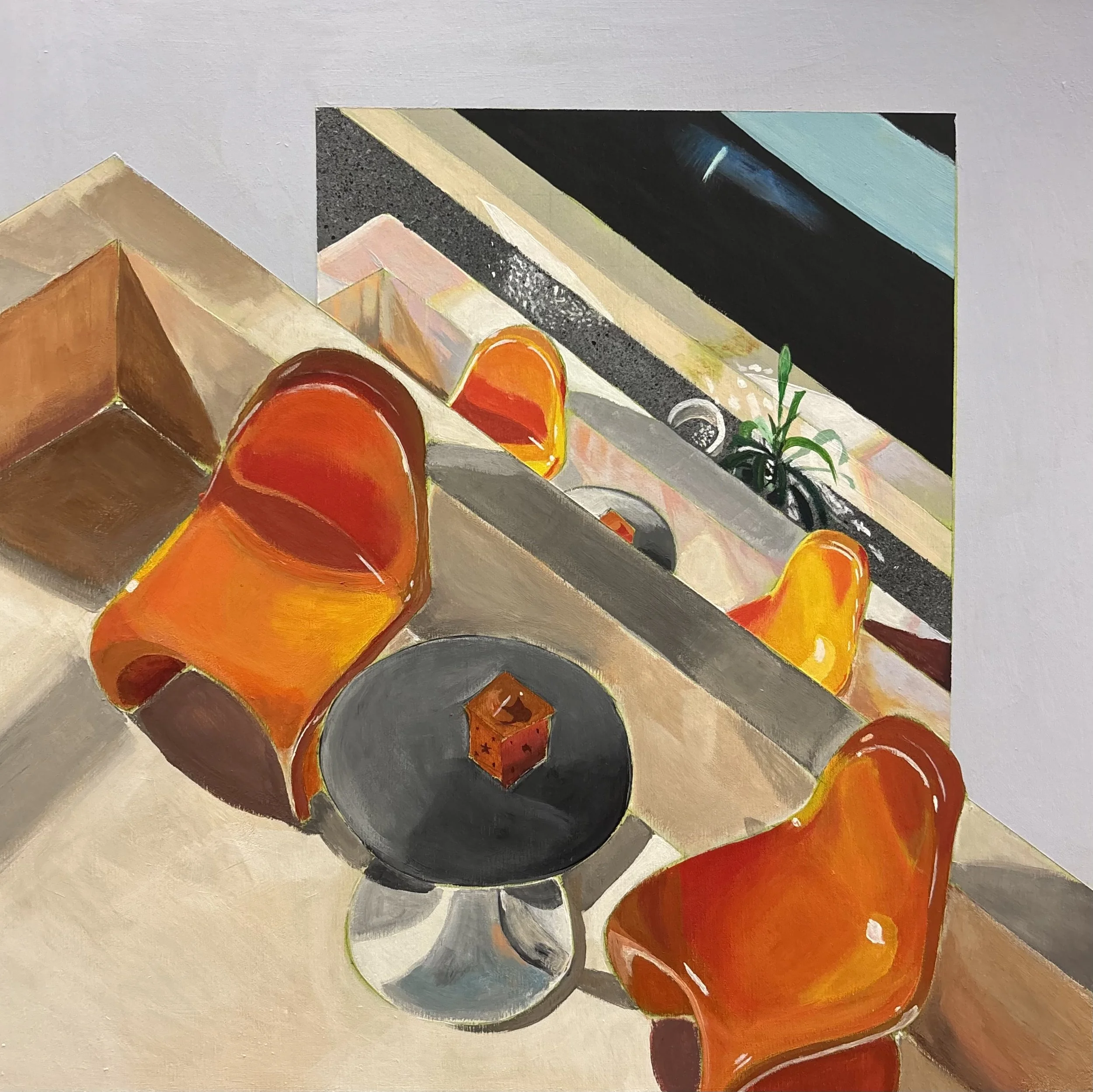 “My paintings and ceramics flirt with the line between fine art and decoration, using both trending and vintage colours, patterns, and objects that evoke the quotidian, the nostalgic, and the ritual aspects of space. In my practice, I explore feelings of self reflection, inner emotional well being, absence, presence, emptiness and memory.
