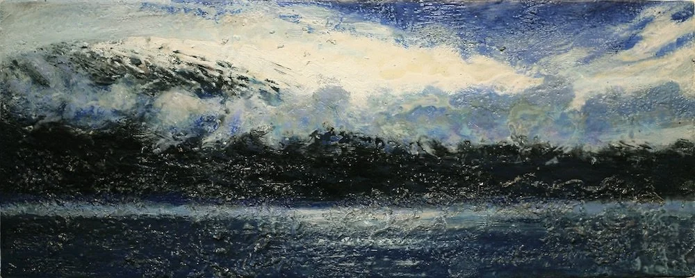 In recent years he has become recognized as an accomplished painter, his work offering an unusual approach to traditional landscape painting. The vital essence of his work owes its strength to simply asking the question: what can beeswax medium actually do? The final painting should set about supplying an unrepentant answer related to the encaustic wax process itself. This age-old encaustic method meaning "to burn in" needs to be applied with some swiftness. The beeswax is heated in garage-sale electric frying pans made molten hot and it is liable to cool on the brush if not handled with some speed. The result is that you see Mark, in the act of painting, the work a permanent present participle of creativity. The modish word to describe such action is "marks," but that implies discrete traces of remote activity. In his case, the more you look, the more you see the paint, the pigment, and the beeswax in a state of turbulent self-animation