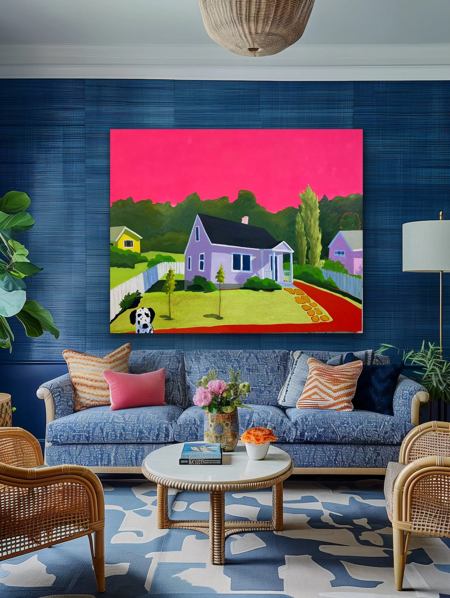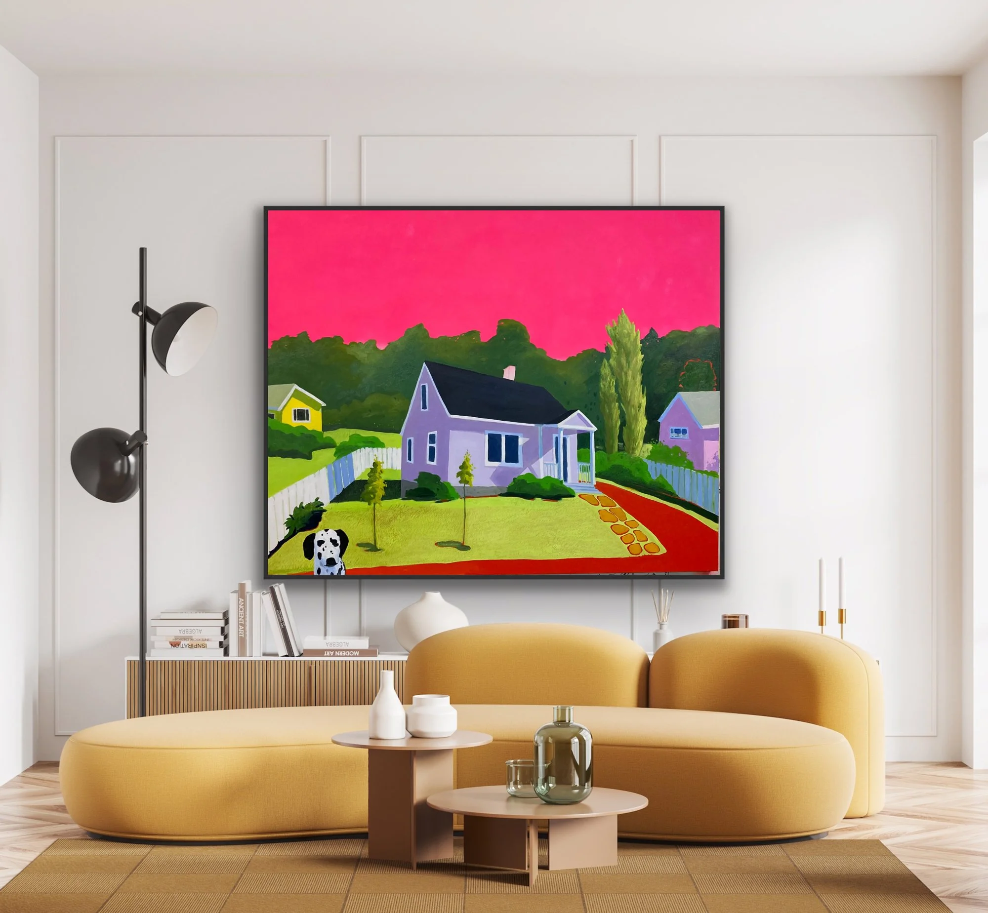 “The title of my show, "a perfect day" reflects a juxtaposition between vibrant suburban scenes of post-war houses and the underlying tensions of contemporary life. Through my choice of colors, I aim to connect these seemingly idyllic settings to the provocative themes embodied in the titles of each painting.